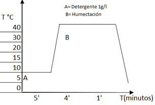 Se utilizó el premordentado con 21% de alumbre y 12% de Bitartrato de potasio en una relación de baño 1/10. Según la curva de pretratamientos que se presenta en la Figura 3, en el Punto A se adiciona la solución con las madejas de hilado de 5.5 g, en el punto B se eleva la temperatura a ebullición por un tiempo de 60 minutos, después se realiza el enjuague, escurrido y secado en lugares de cerrados de preferencia. Este proceso prepara el hilado de alpaca para que el pigmento se adhiera de mejor manera en la estructura de la fibra.